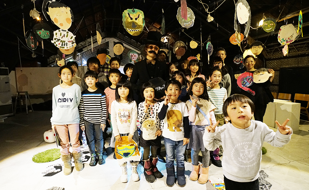 暗い会場に、こどもたちが描いた「ねむりの顔←→モンスターの顔」のおめんが100数十個ぶらさがっています。