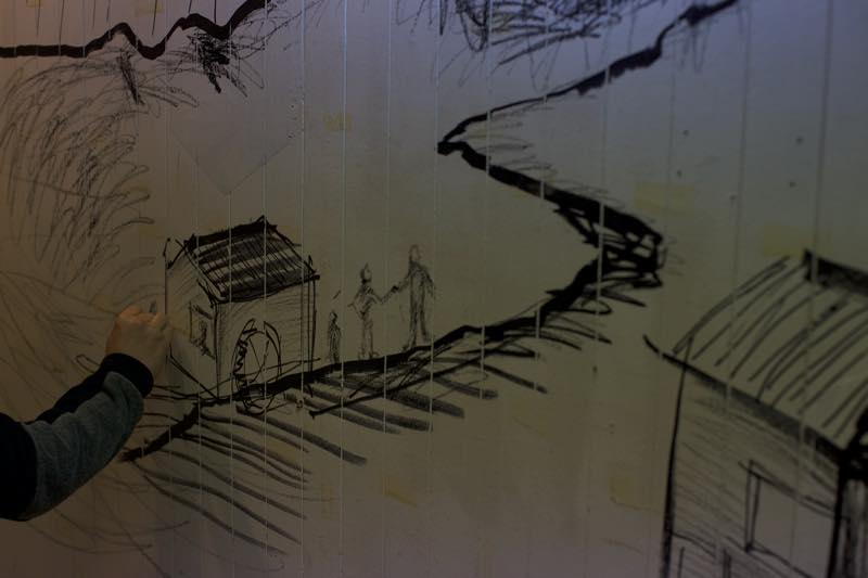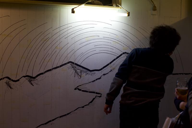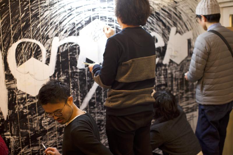 丁寧に描きはじめてしばらくすると、お客さんにもマーカーを渡していっしょにドローイング。そのうち、絵全体を黒く塗りつぶしはじめます。