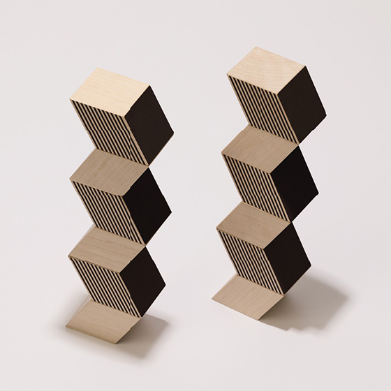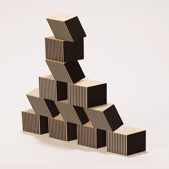 そして、ミラノサローネで発表した新作「BRocca」。写真に撮ると、不思議に空間がゆがんでみえる積み木です。