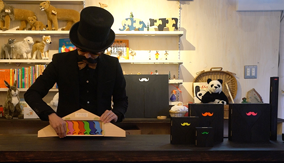 トゥルーリの積み木ショー。ヒゲのマークがついた黒い箱を開くと、中から積み木があらわれます。まずはアレックス・ランドルフのボードゲーム「こぶたのレース」のこぶたが登場。