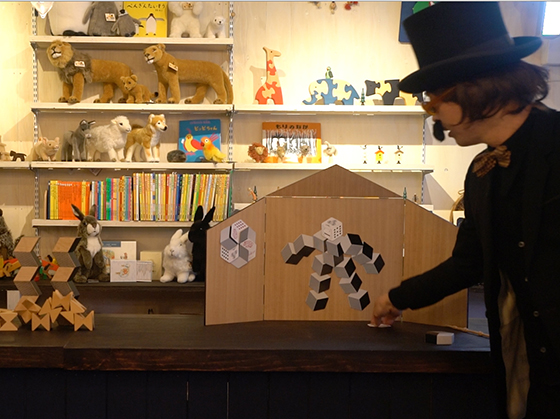 さて。このあと、これまで登場した「こぶたのレース」「ネフ・シュピール」「BRocca」と、お店の小さな人形を使った大技で積み木ショーはクライマックスを迎える、のですが。。