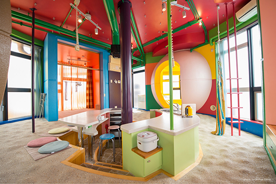 三鷹天命反転住宅は、内外装に14色の鮮やかな色が施され一部屋一部屋の色の組み合わせが全く異なることから、「極彩色の死なない家」(瀬戸内寂聴氏)として東京西郊外の三鷹市のランドマーク的存在にもなっています。