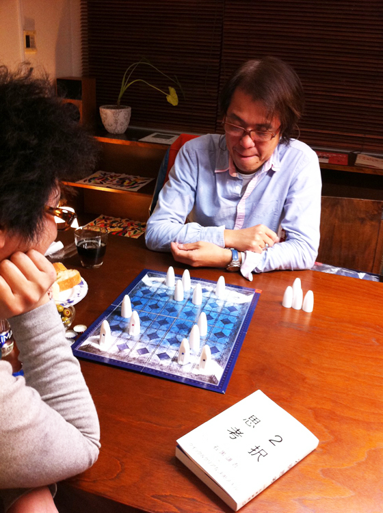 さて、この石黒さんの『2択思考』がゲームで通用するかというということで、アレックス・ランドルフの『ガイスター』をまずカッキーとプレイ!