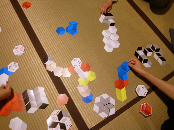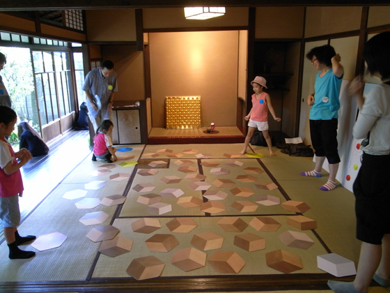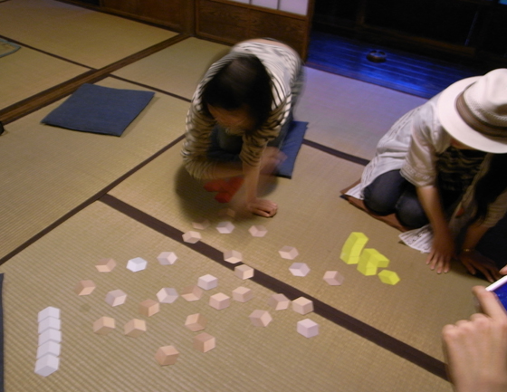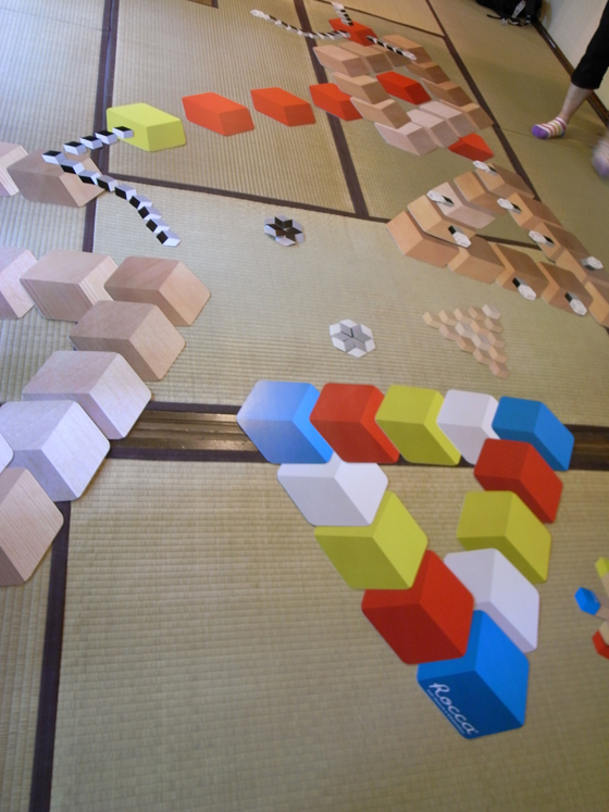 会場には自由に遊べるRoccaを置きます。畳の上、縁側の上で、いろんな「二次元積み木」をして