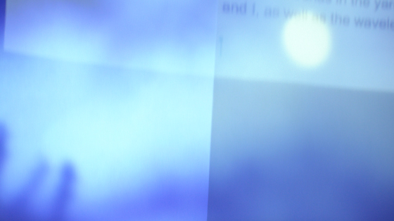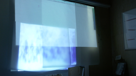 トレーシングペーパーを重ねて吊るし、ジョナスの映画を後方のプロジェクターから投影。