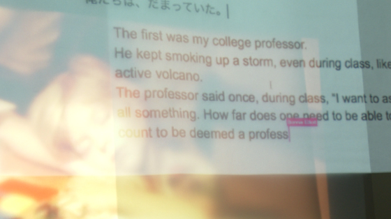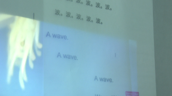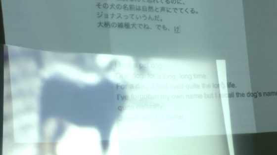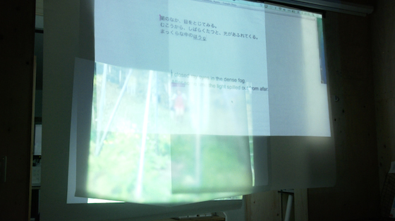 前方のプロジェクターから、いしいさんの「その場小説」を上部に、ボニーの「その場翻訳」を下部に投影します。