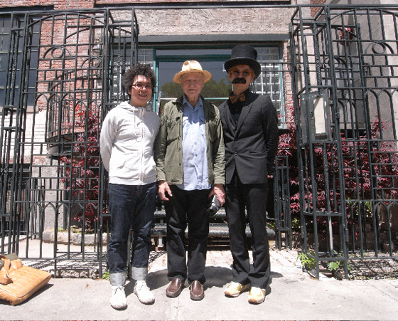 メカスさんのアパートメントの前で3人で記念撮影。