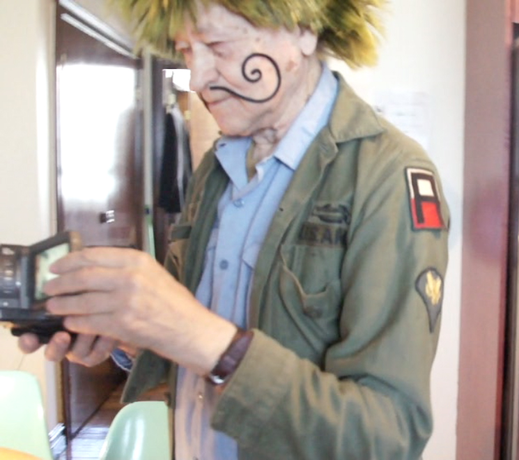 前回うかがった時もヒゲと帽子で盛り上がったのですが、今回は自宅に着くなりメカスさんが緑色のかぶりものを!