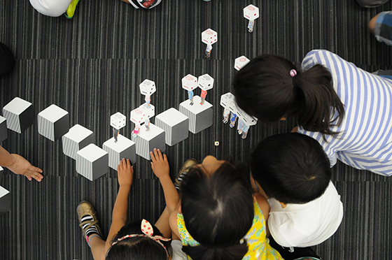 カードブロックの色合わせゲーム大会も開かれ、ゲームルールのぐるっと回転で困惑する子どもが続出