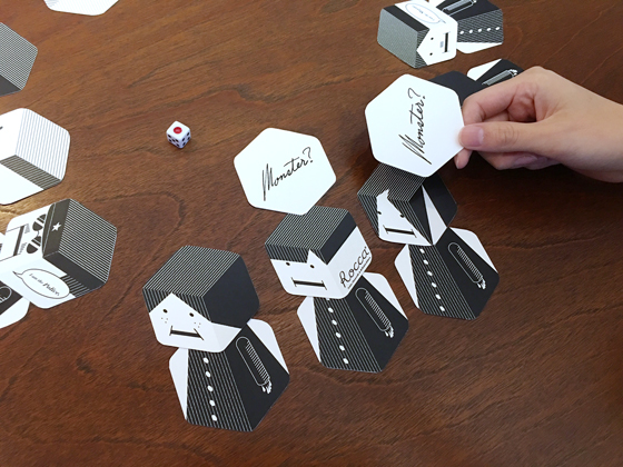 こどもたちがきのこの絵を描いた箱がコマ。コマの上にコマが乗って運ばれたり、上にかぶさられて動けなくなったりしながらゴールを目指します。