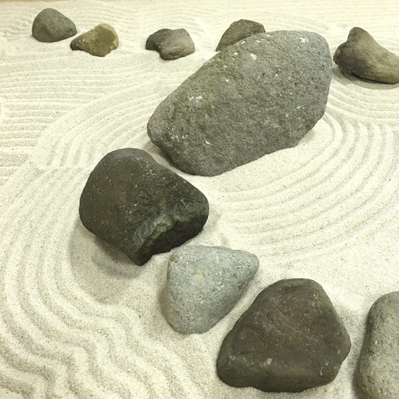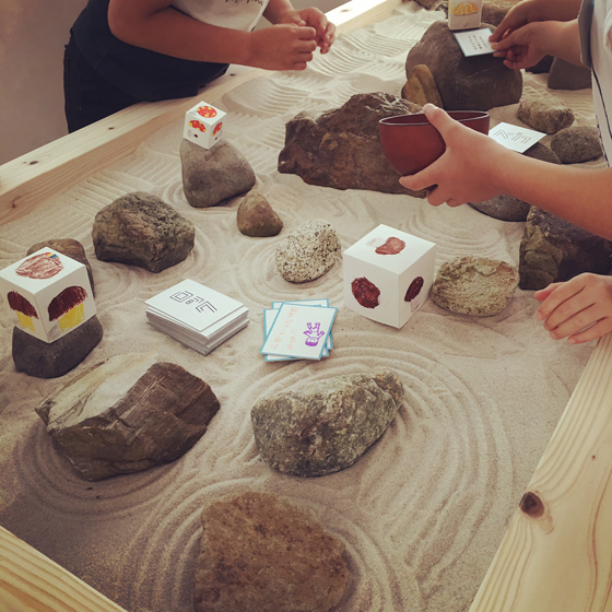 山形市内を流れる馬見ヶ崎川からひろってきた石と、砂でつくった石庭がゲームフィールド。